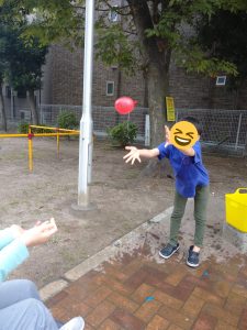 上手にしっかりキャッチしないと・・・風船が割れて一瞬でビシャビシャに!!