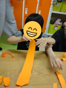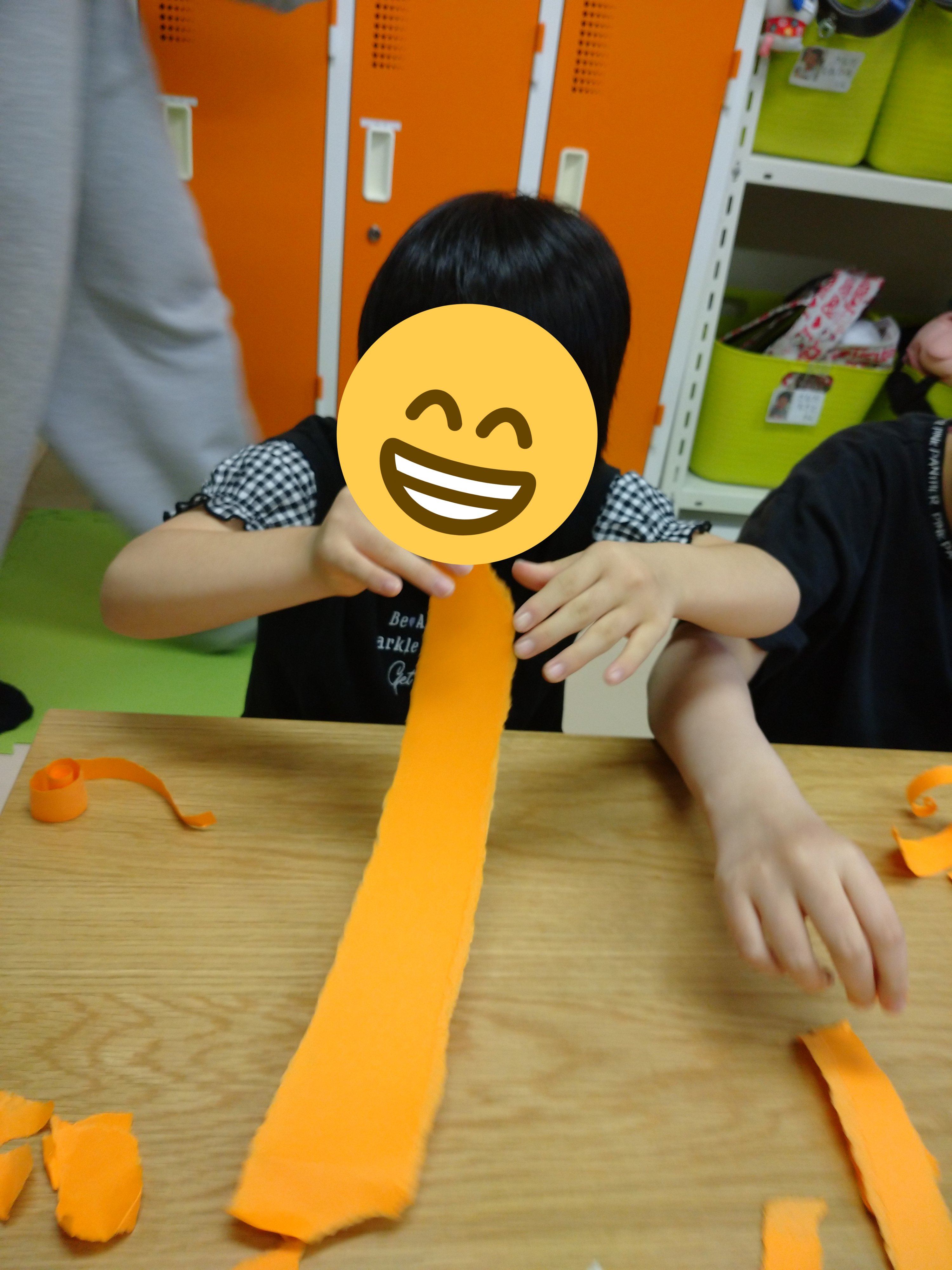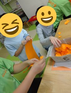 まずはカボチャ色の画用紙をビリビリ~と小さく細切れにしていきます!